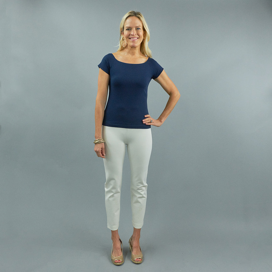 This boatneck top is a wardrobe staple!! It is two layers of stretch jersey, making it "doubly" comfortable and flattering! It is the "go-to" top to wear with all of our bottoms, and will work into your closet perfectly!