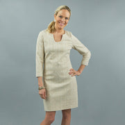 Stretch Tweed with flecks of gold thread makes this dress a great Holiday pick. Lined, fitted with back zipper. Add it to your last minute cocktail dress quiver...