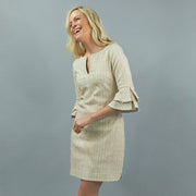 Back by popular demand... a style that will always be in style. Pleated 3/4 sleeve adds sophistication while the stretch tweed with gold thread adds a fancy flare. The perfect dress for Holiday and all the fun events that are in store! Back invisible zipper.