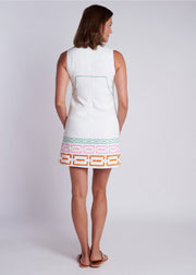 Step into effortless elegance with the Olive Mini Dress, crafted from soft white stretch linen that’s perfect for warm-weather days. The sleek, fitted design is elevated by a playful, retro-inspired embroidered trim that adds a pop of color and nostalgia. Whether you're headed to brunch or an afternoon garden party, this dress combines classic charm with a touch of vintage flair.