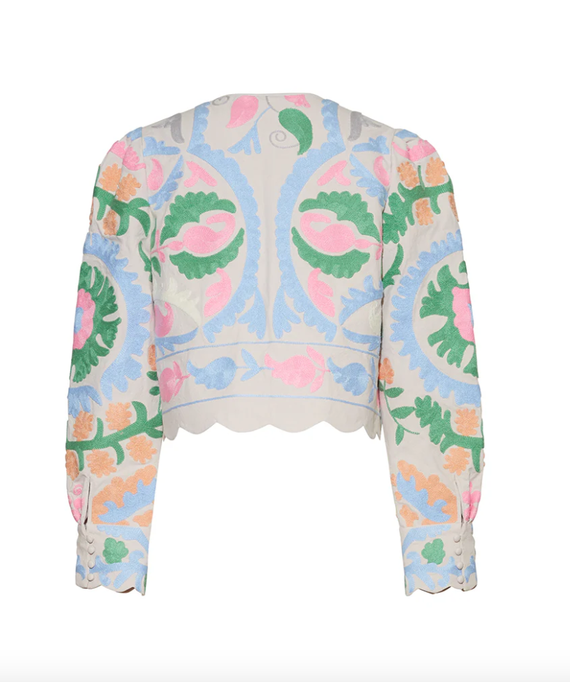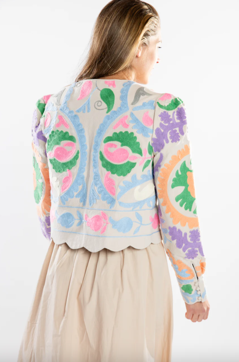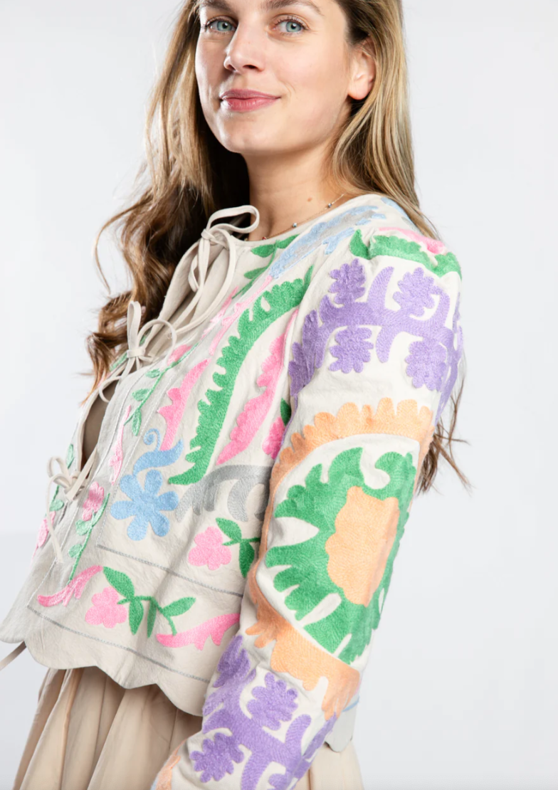 Introducing the Chaira: Expertly tailored this colorful embroidered jacket brings a touch of artistry to your wardrobe. A relaxed fit with with detailed sleeves and front ties It is a statement piece for sure! Pair with our sand linen Lillian pant or dress it up with our Serena skirt!