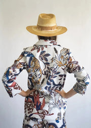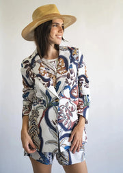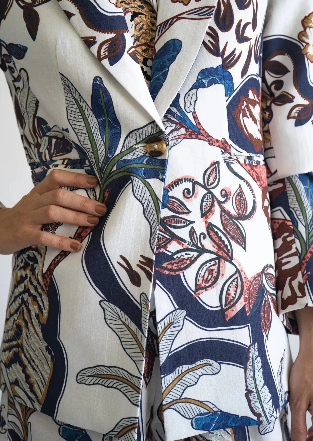 Imagine a carefully crafted blazer that paints a vivid picture – playful tigers, lively palm trees, and dancing leaves against a clean white backdrop.Whether you're dressing up for an occasion or adding flair to your casual look, the Color Tiger Blazer is your ticket to standout style with a touch of untamed spirit. Get ready to turn heads with this wild twist on classic tailoring!