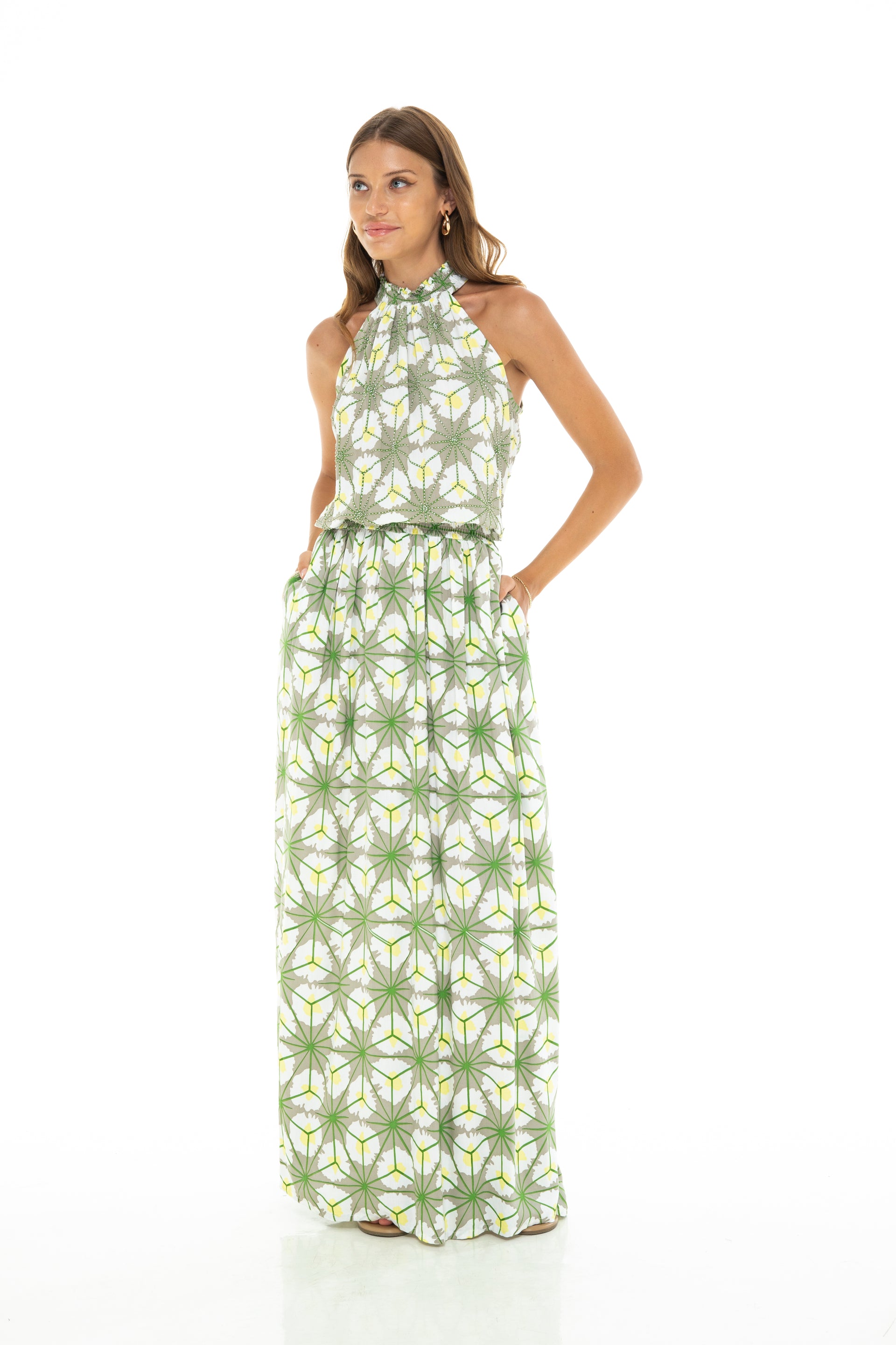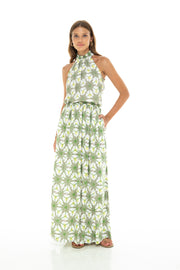 Turn heads this summer in the Skemo Spring Alexa Long Dress. This green halter maxi is as comfortable as it is playful, flowing effortlessly to keep you cool and stylish during sunny days and warm evenings. Perfect for countless summer events and endless fun.