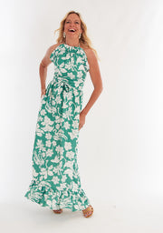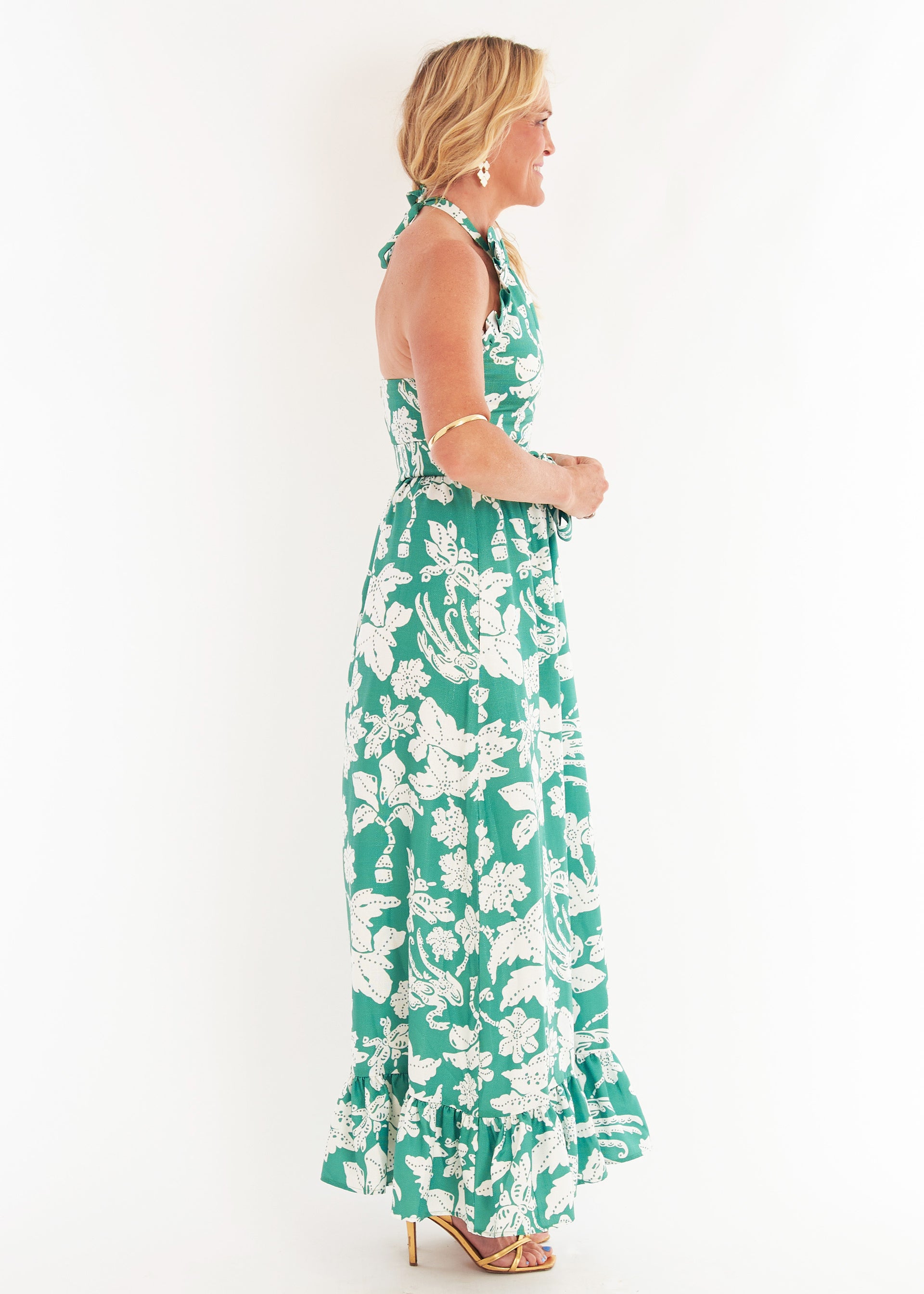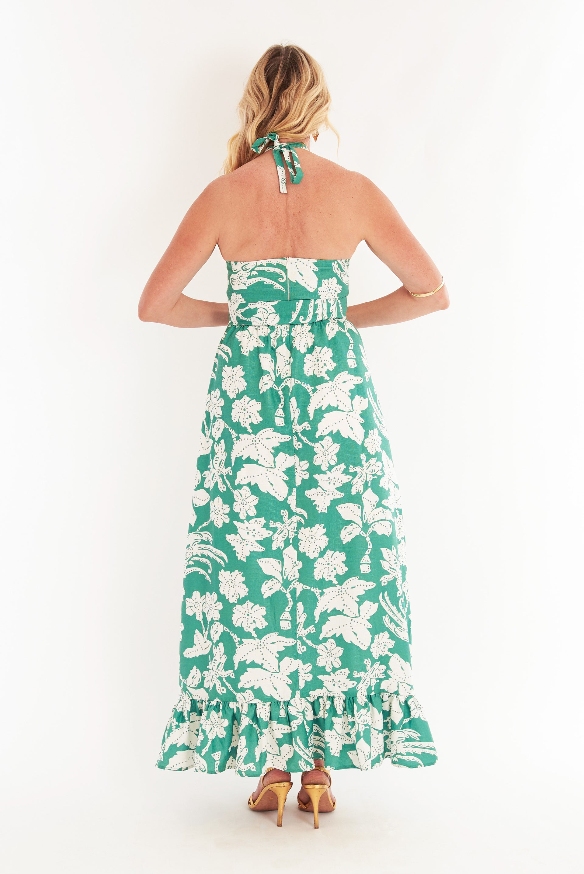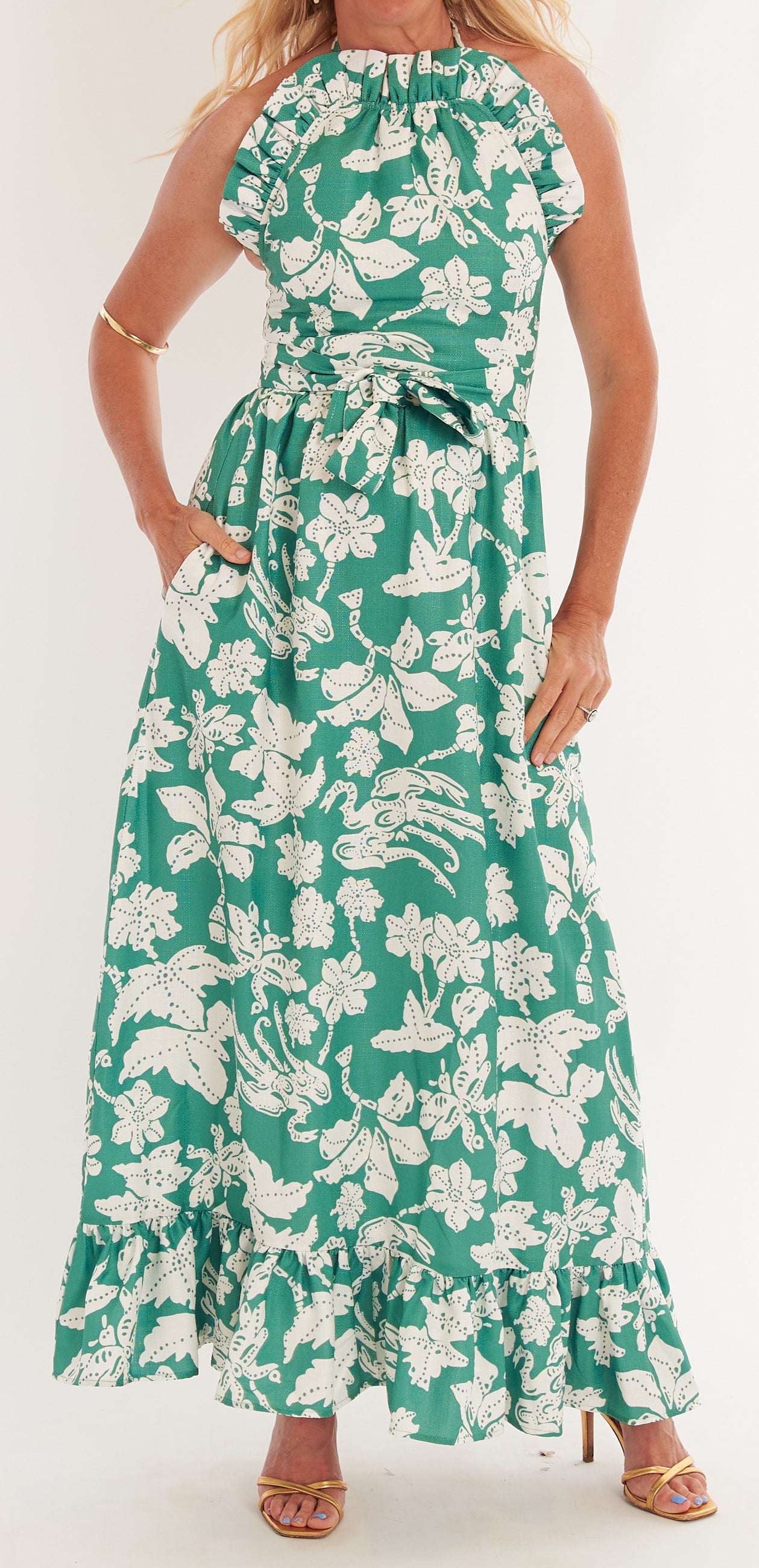 A Cult Favorite! This flattering silhouette features a feminine ruffle trimmed halter top and a ruffled hem. Just add a heel and statement earring, and you'll be ready for any special event this season! WARNING: prepare yourself for compliments all night long!