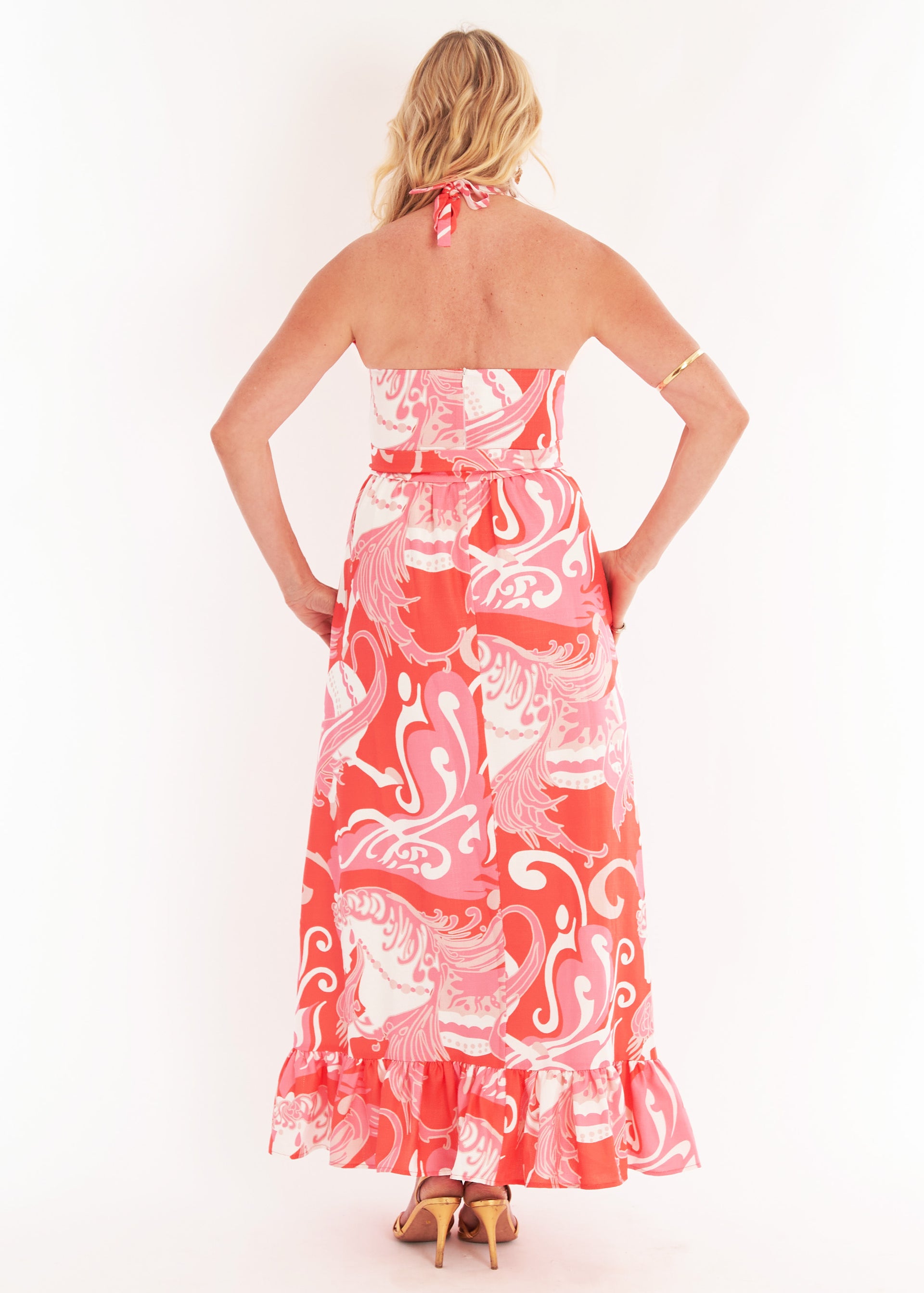 A Cult Favorite! This flattering silhouette features a feminine ruffle trimmed halter top and a ruffled hem. Just add a heel and statement earring, and you'll be ready for any special event this season! WARNING: prepare yourself for compliments all night long!