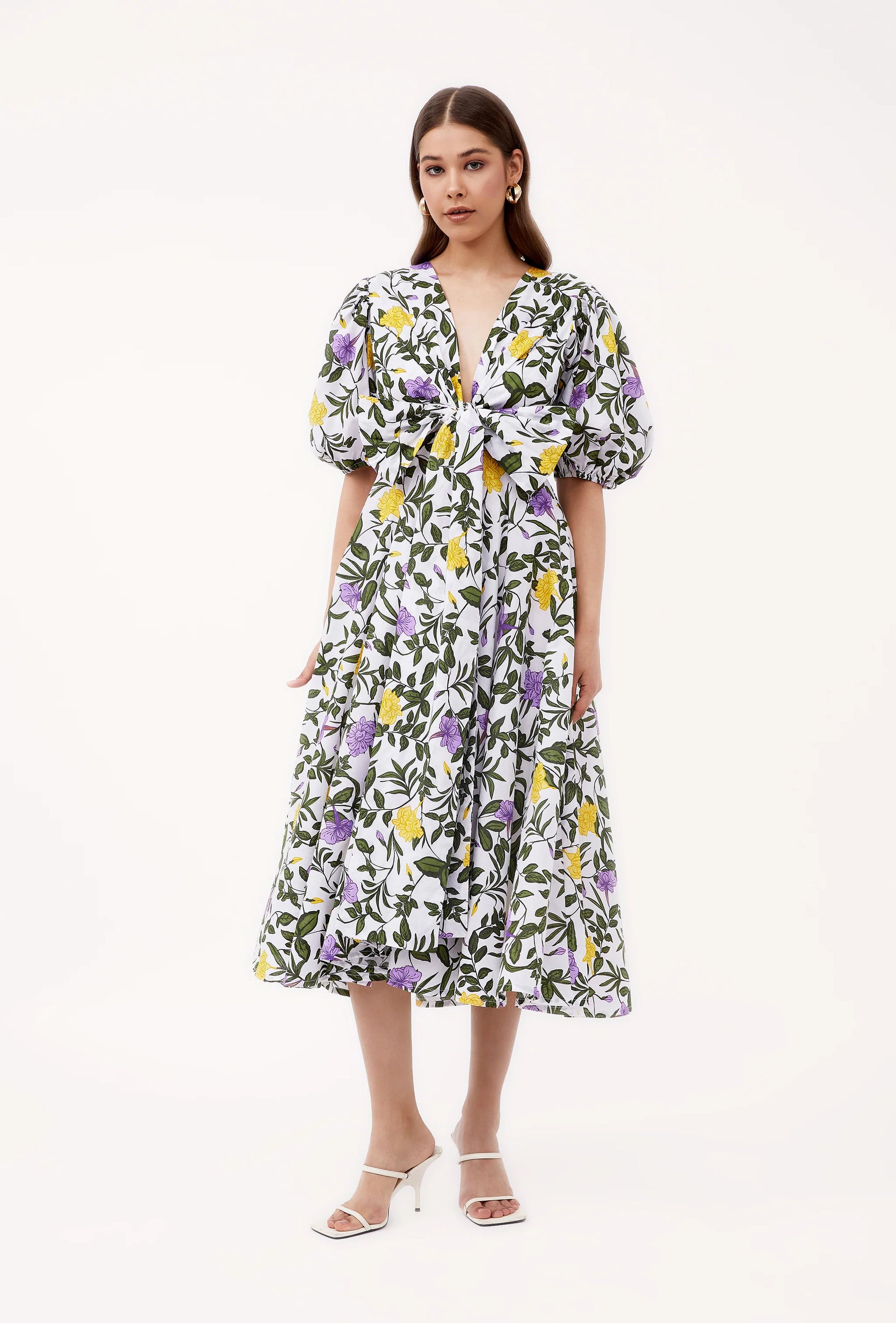 Crafted from 8 meters of softest, breathable cotton, the Lola is made to twirl in and spread joy! She is chic, easy-to-wear and incredibly versatile: Tie her in the front (with a bow) for an enticing, deep V-neckline or in the back for a bit more coverage. The print design echoes the charm of Tuscan gardens in full bloom, showcasing vivid depictions of lilies and lush greens.All our artwork is original and hand- screen-printed, every piece is thus unique and perfectly imperfect.