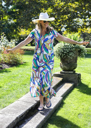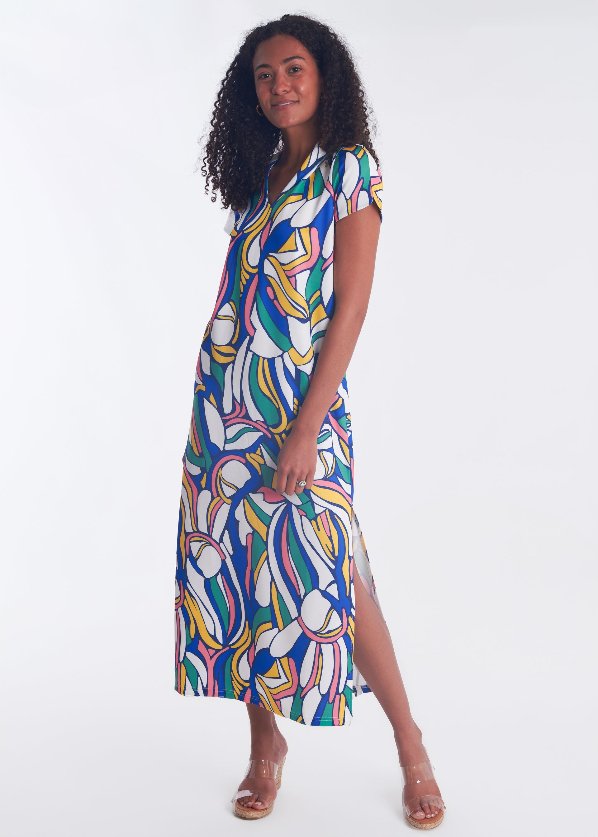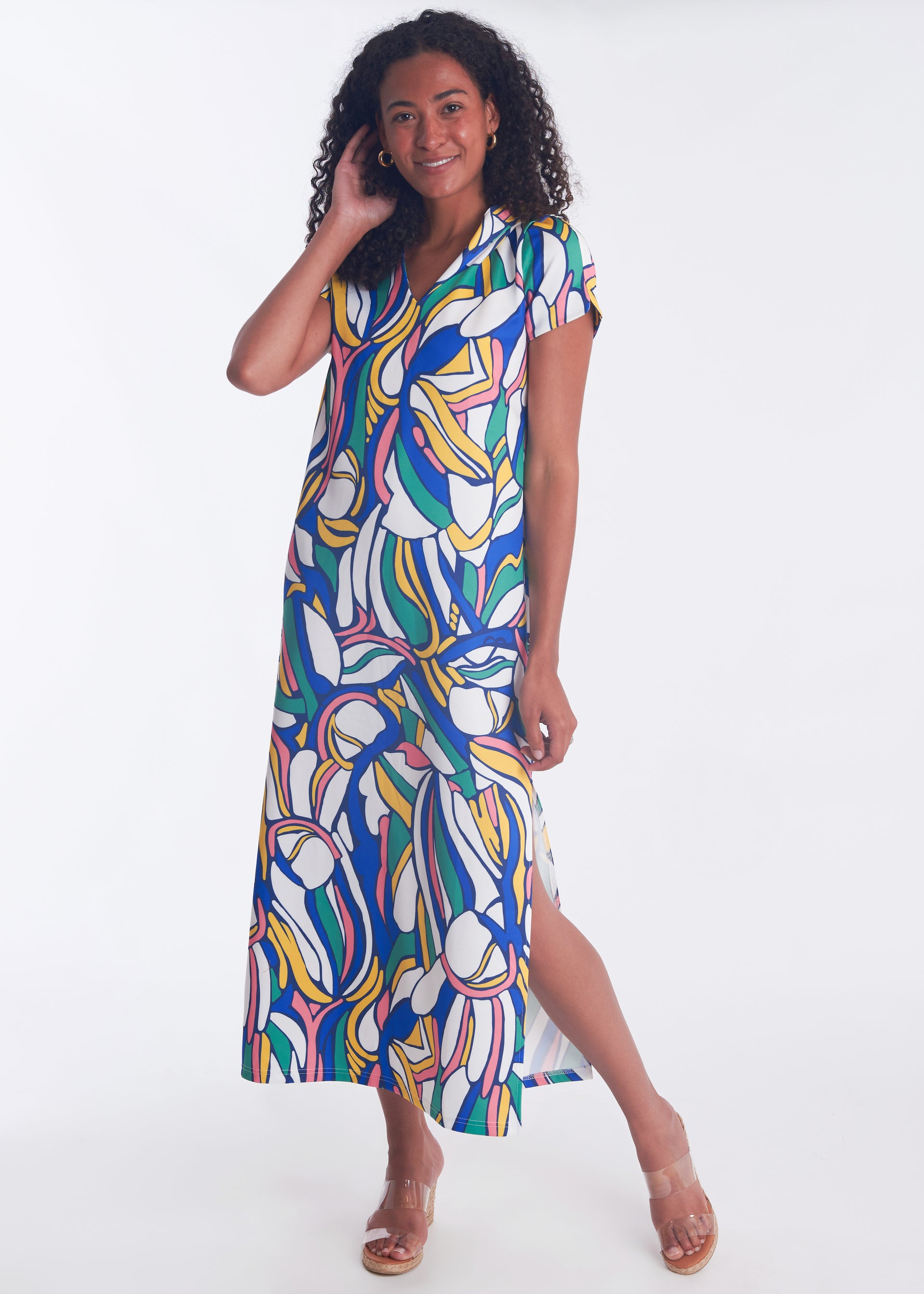 Our take on a "t-shirt dress".... Versatile and comfortable yet "put-together," our Delray Dress features short sleeves, a v-neckline, and side slits for optimal movement and comfort.