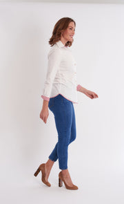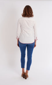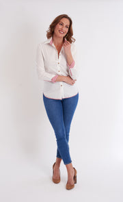 The Bryson Button Down in White/Mulberry Stripe puts a playful spin on a classic look. Featuring clean, crisp white fabric with gold buttons and peek-a-boo striped cuffs, this shirt adds a fun surprise to your everyday style. Perfect for mixing timeless elegance with a touch of whimsy.