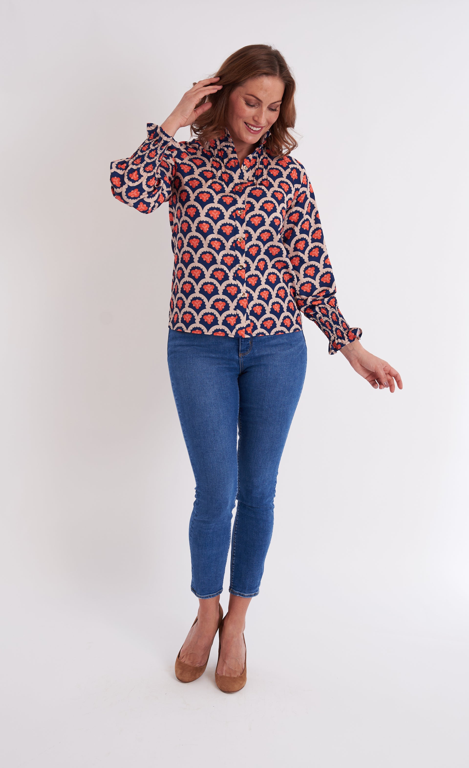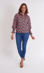 The Plato Blouse features a bold yet classic print that's sure to turn heads. With a high collar, button-front design, and elastic cuffs, it offers a playful mix of structure and comfort. Easy to dress up or down, this blouse adds a stylish twist to any outfit—whether you’re headed to brunch or the office.