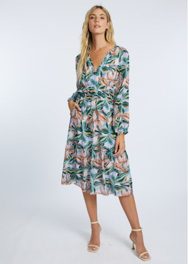 The dress is finished with a tiered ruffle at the hem, adding movement and charm to its design. Adorned in our exclusive Sea Leaves print, it showcases a vibrant mix of pink, blue, and deep green hues, brought to life through intricate leafy patterns. Perfect for any occasion, the Quinn Dress is your go-to piece for effortless elegance this season.