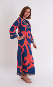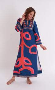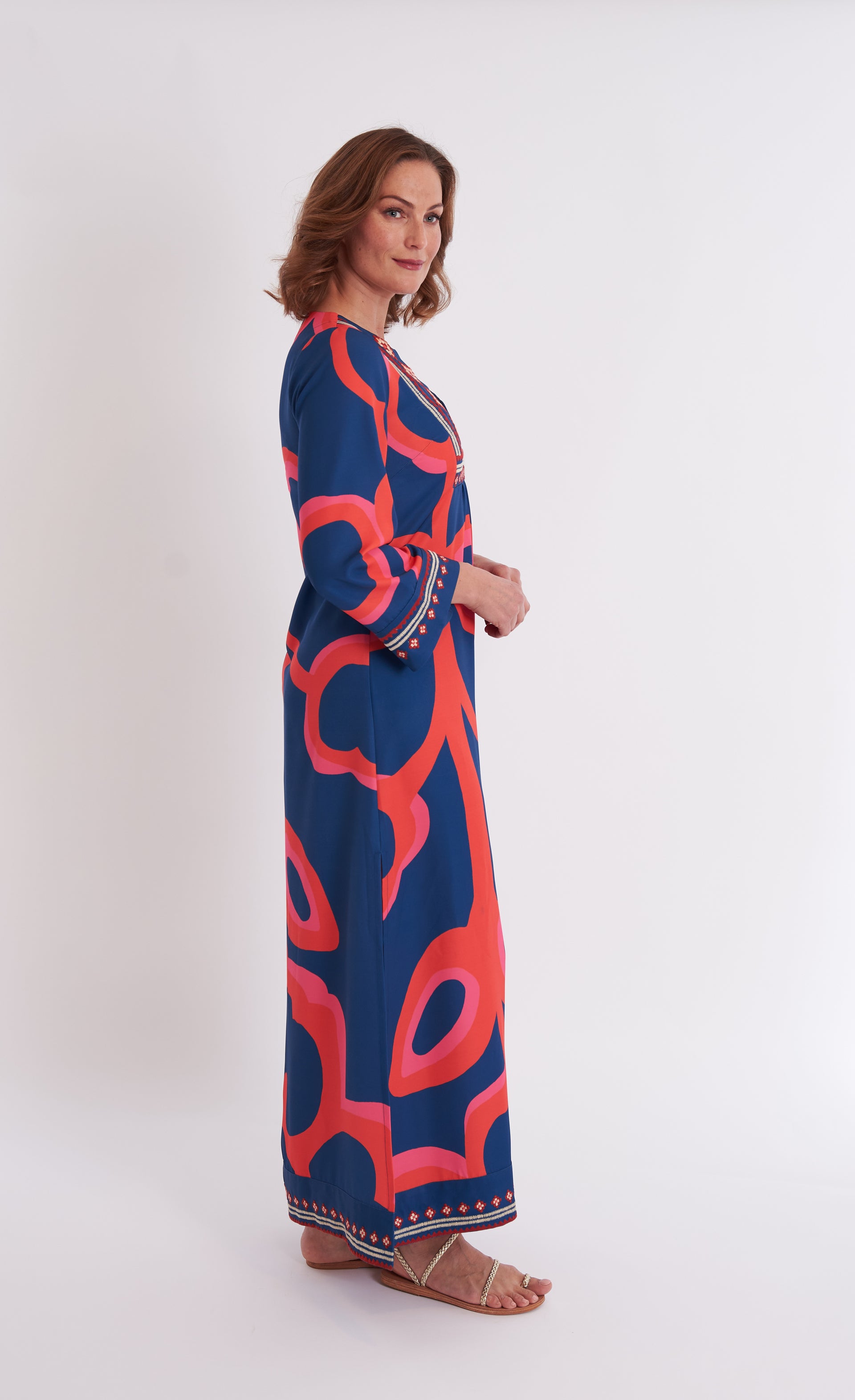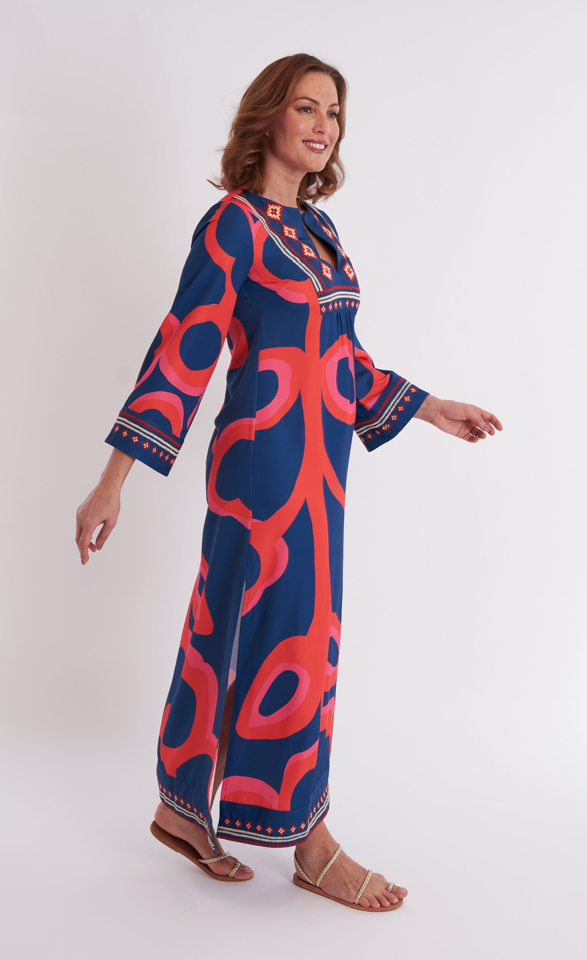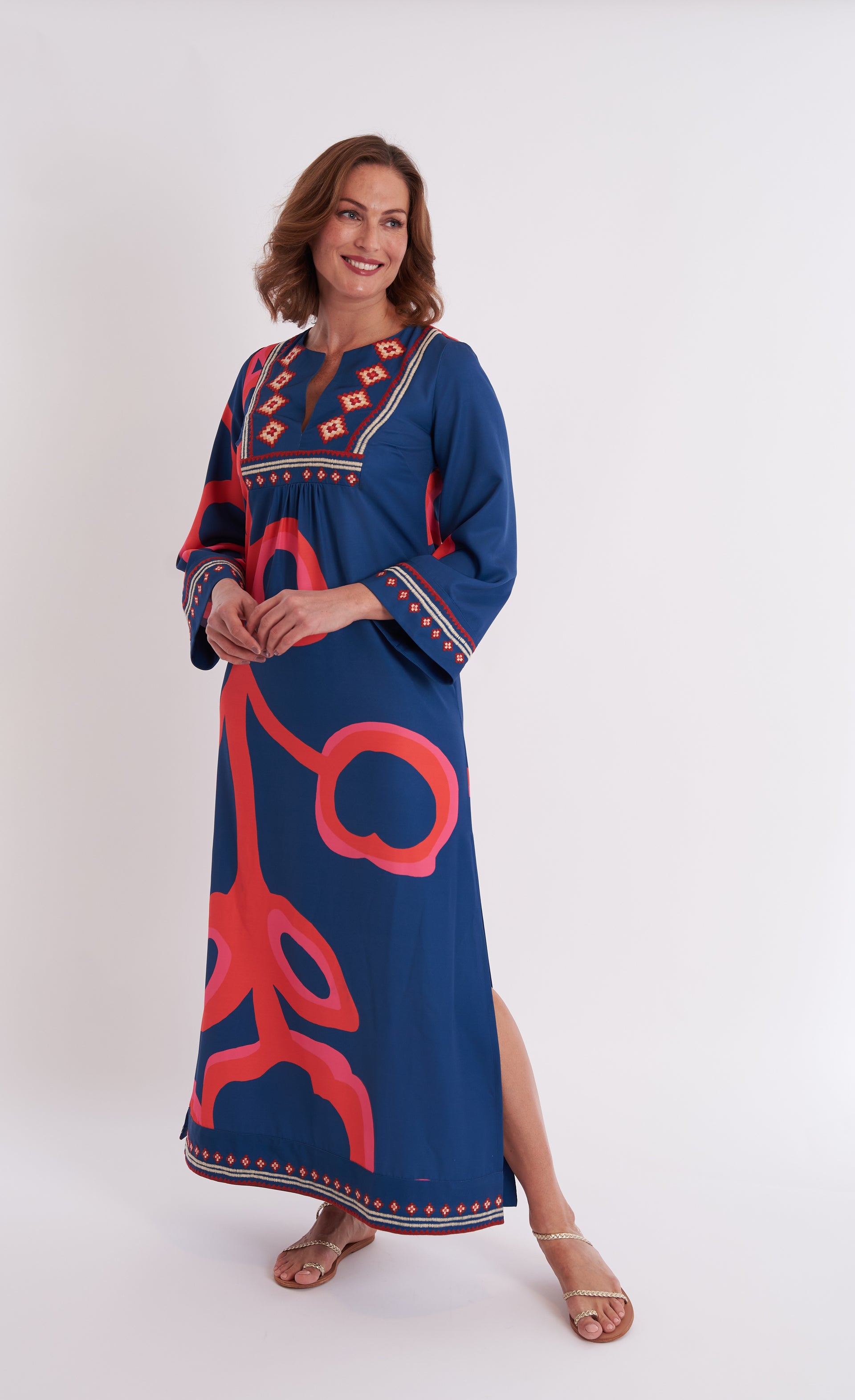 Step into boho chic with the Crispell Caftan in Ocean Fire. This new style features beautiful embroidered trim and flows effortlessly, making it easy to wear with flats for a relaxed look or dress up with heels for a night out. Playful and versatile, it’s a must-have for your wardrobe.