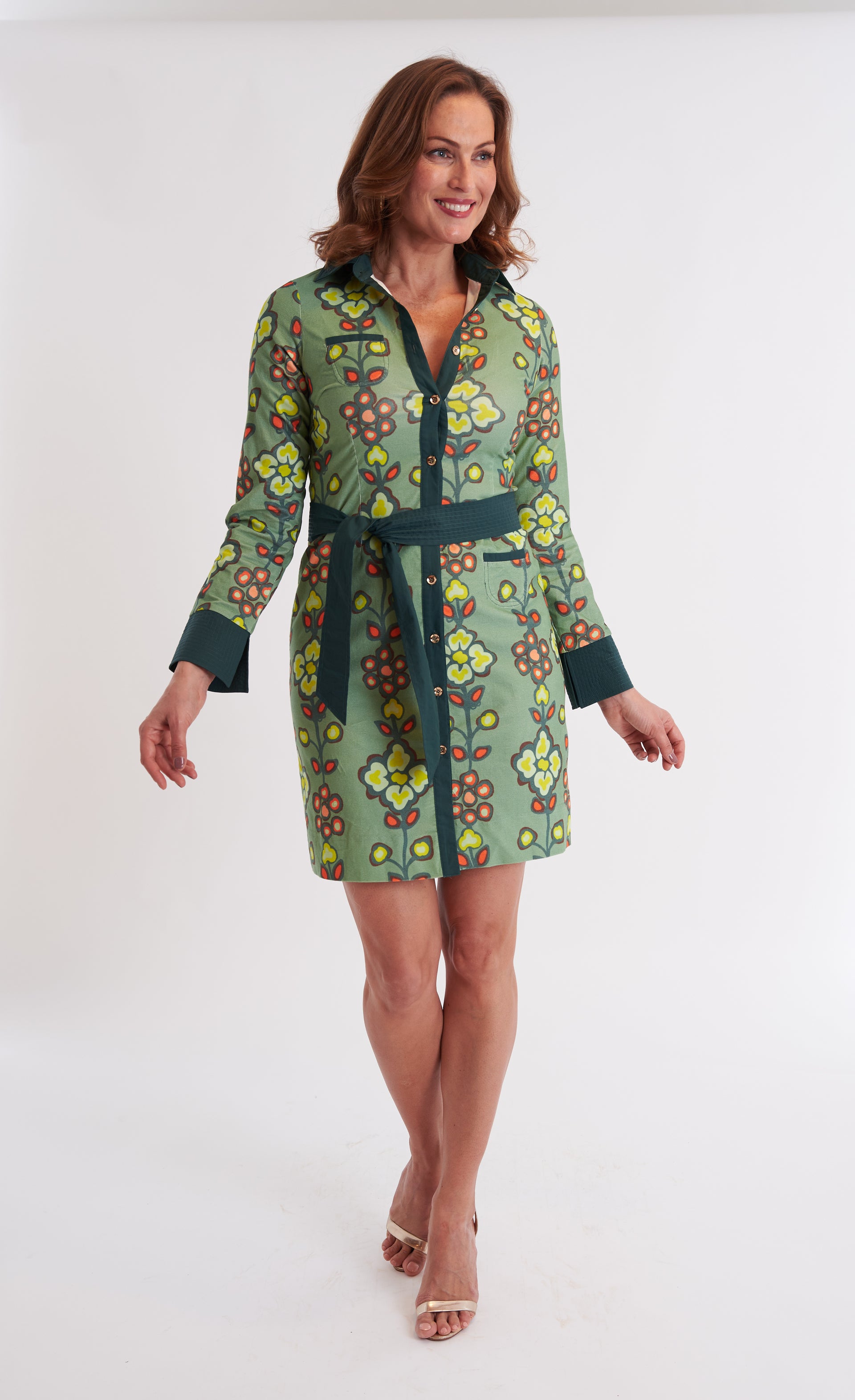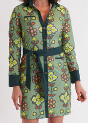 The Midori Shirtdress in Serendipity Moss is your go-to for effortless day-to-night style. Featuring a belted waist, contrasting cuffs, collar, and placket, plus a button-front design, this dress showcases an elongating print that flatters every figure. Playful and versatile, it’s perfect for any occasion.