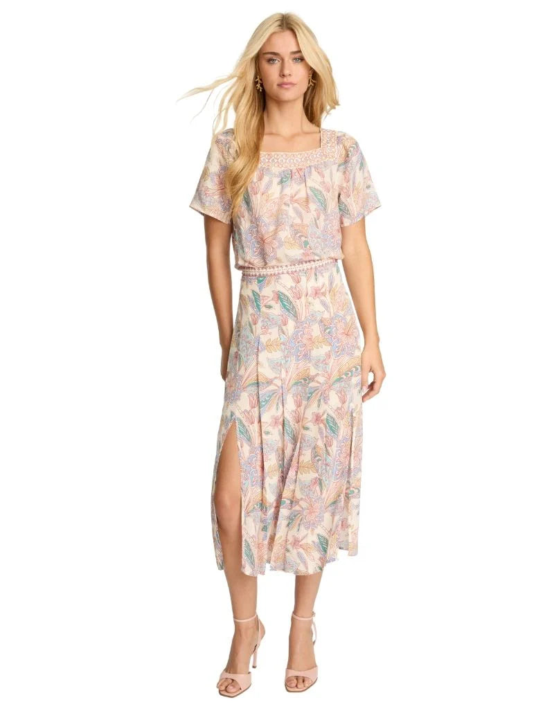 Rendered in a soft palette of blush, muted teal, warm olive, and cream with fine linework, the print feels both delicate and softly graphic. Designed with a flattering high-rise waist and a soft, flowing drape, the Glenda Skirt is finished with two front slits that add movement and subtle allure. Easy to dress up or down, it pairs beautifully with simple knits, tucked-in blouses, or matching Paisley Floral pieces for a coordinated look.