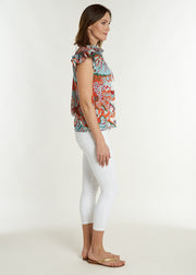 Frilly detailing around the neck and armholes is the secret behind the smart-yet-playful feel of this sleeveless shirt.  Cut in the softest cotton, this top is easy to wear with so many looks and is sure to become a staple this season!