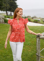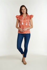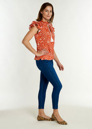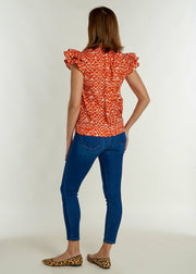 Frilly detailing around the neck and armholes is the secret behind the smart-yet-playful feel of this sleeveless shirt. Cut in the softest cotton, this top is easy to wear with so many looks and is sure to become a staple this season!