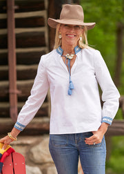 Our Norway Blouse features a loose fitting silhouette, split neckline and an embroidered Mandarine collar. This style is casual enough for a day at the beach or dressy enough for drinks - just pair with jeans, sandals, and gold jewelry! Just consider the milage this top will get!