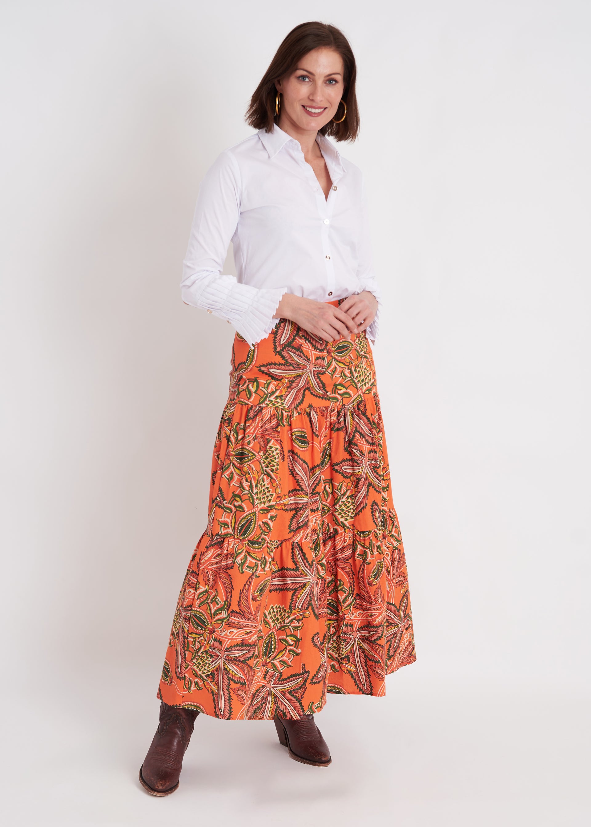 YES! YES! YES! Talk about a show stopper! This skirt is it! The Print, the stretch linen, the tiered skirt! Perfection.  Easily paired with a classic white button down, a chunky knit sweater and boots, or a t-shirt and denim jacket... the options are endless!