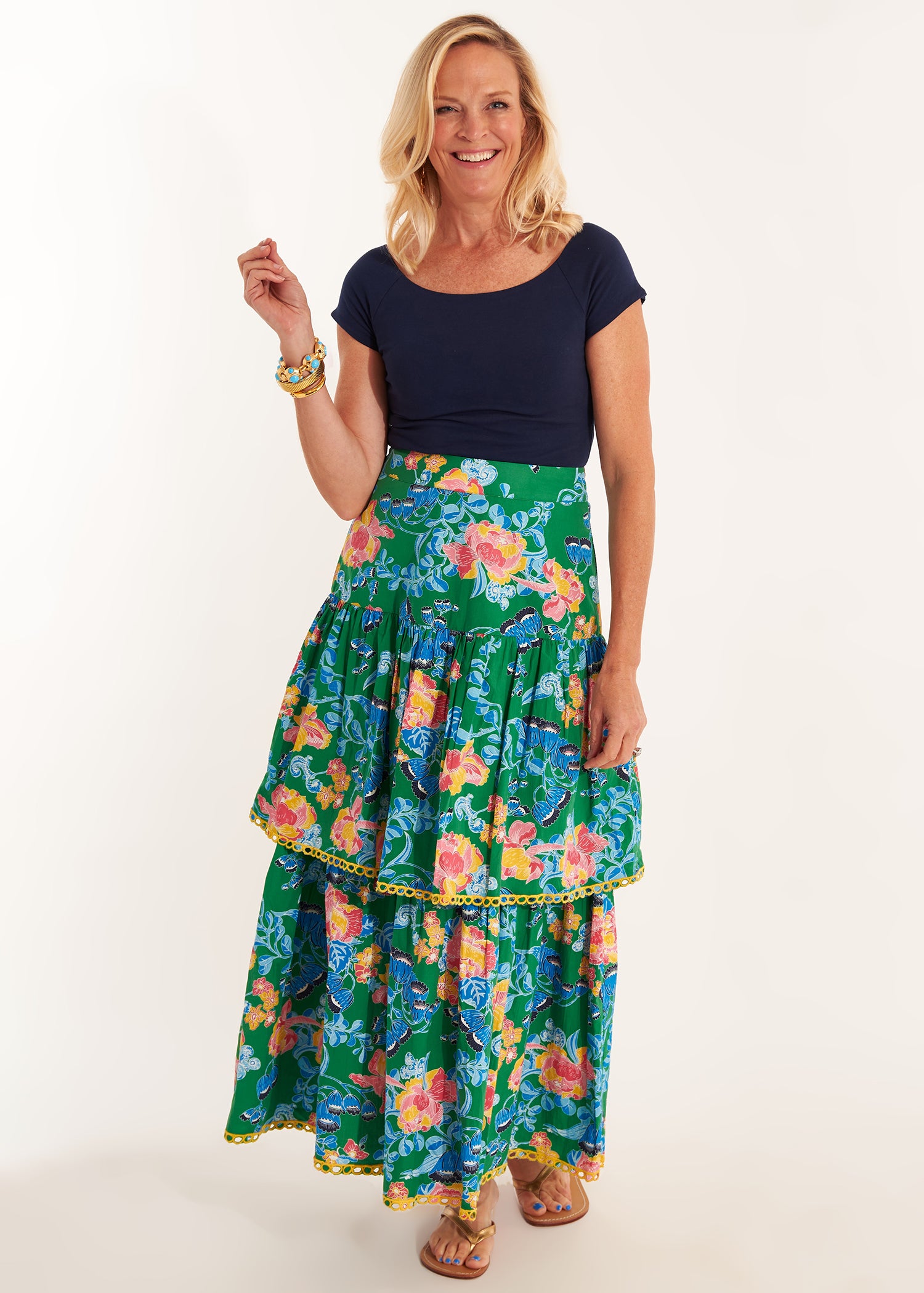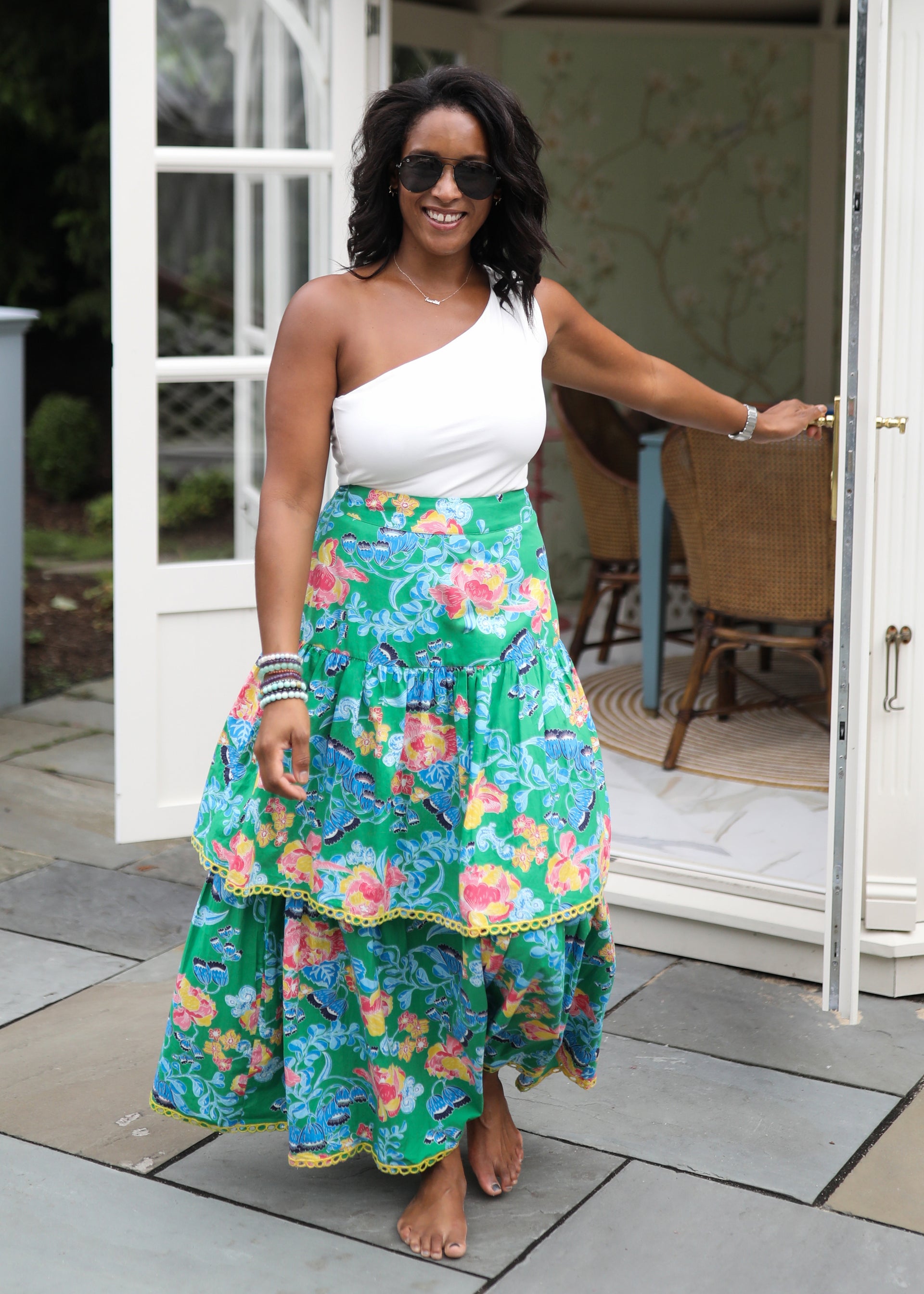 Meet the Shelley Skirt, where floral beauty meets versatile style. In a rich green hue with delicate florals, this tiered maxi skirt flows with every step, creating a soft, graceful silhouette. Whether you’re keeping it casual with a tucked-in tee and sneakers or dressing it up with a blouse and heels, the Shelley Skirt is as adaptable as it is beautiful.