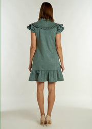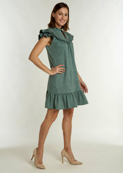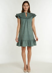 Don't be silly...put on your SILLA! The perfect "throw-er on-er." Our “go-to” dress for summer is now for Fall in our NEW faux suede. This simple yet chic mini features a voluminous shoulder ruffle, Mandarin collar and v-neckline. Perfect for game day, Sunday brunches, apple picking, and more… we are styling this easy silhouette with boots and a felt hat for a flawless fall ensemble.