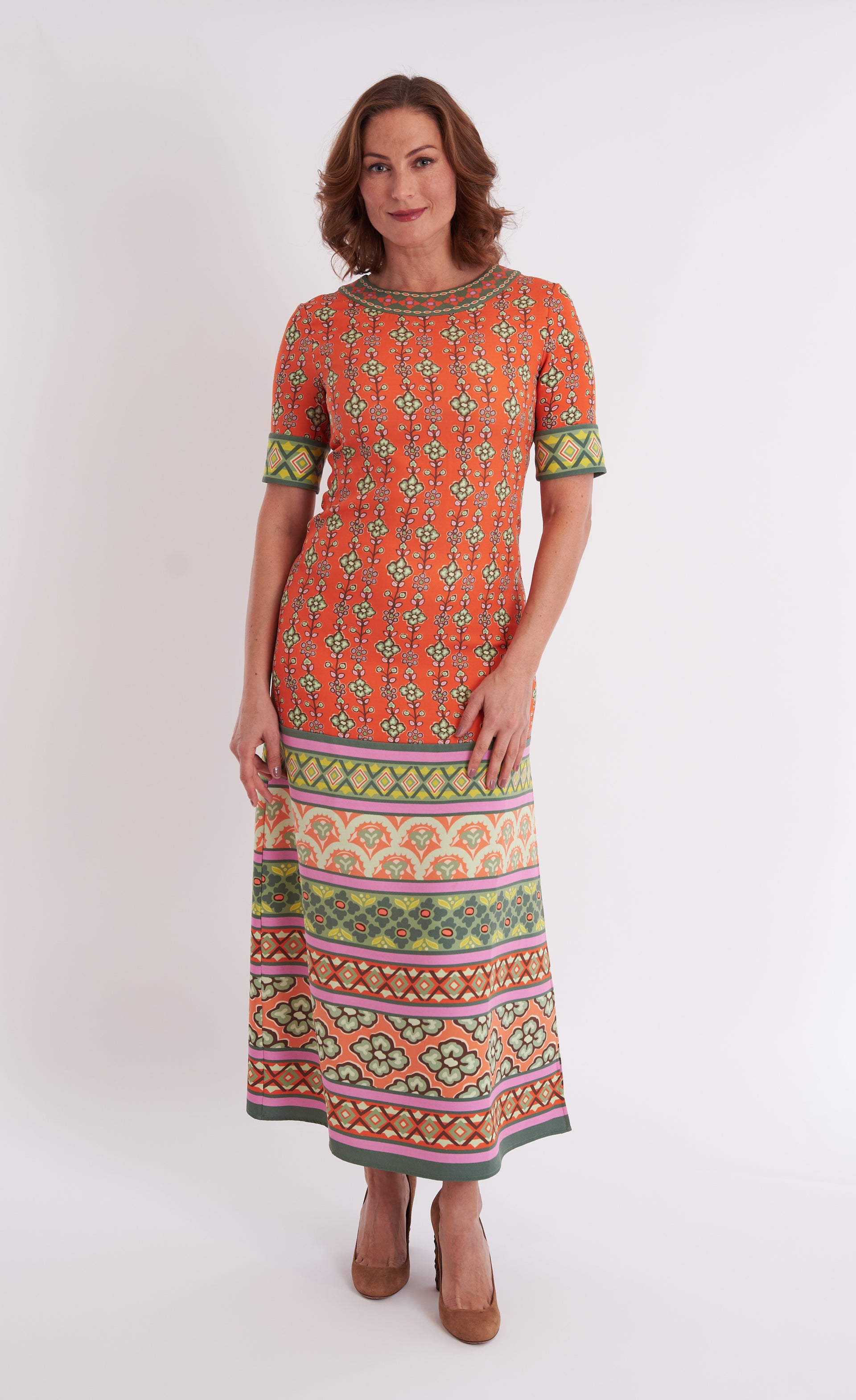 Introducing a refined reimagining of our beloved Ashton silhouette, now featuring a gracefully shortened sleeve that modernizes this iconic design. This one-of-a-kind piece showcases the distinctive Serendipity Pumpkin pattern, making it a truly exceptional addition to any discerning wardrobe. With its sophisticated proportions and exclusive nature, this dress captures the essence of timeless elegance with a contemporary edge.